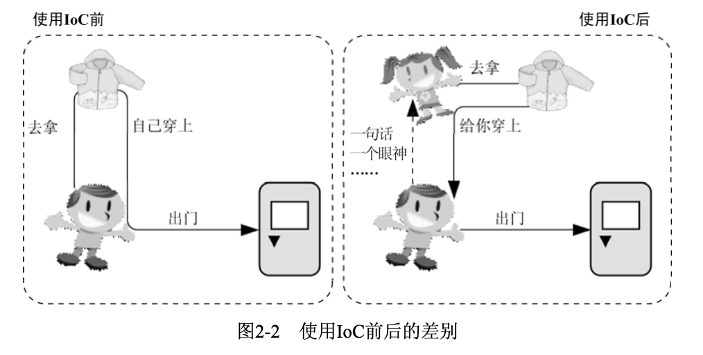 这张图片非常生动形象地描述了 IoC 的性质,它还能进行更多扩展——比如图上的女孩拿到衣服后,可以烫衣服,缝补……以此说明 IoC 容器可以对 Bean 进行非常多的操作,AOP 离开了 IoC,实现也是比较麻烦的。