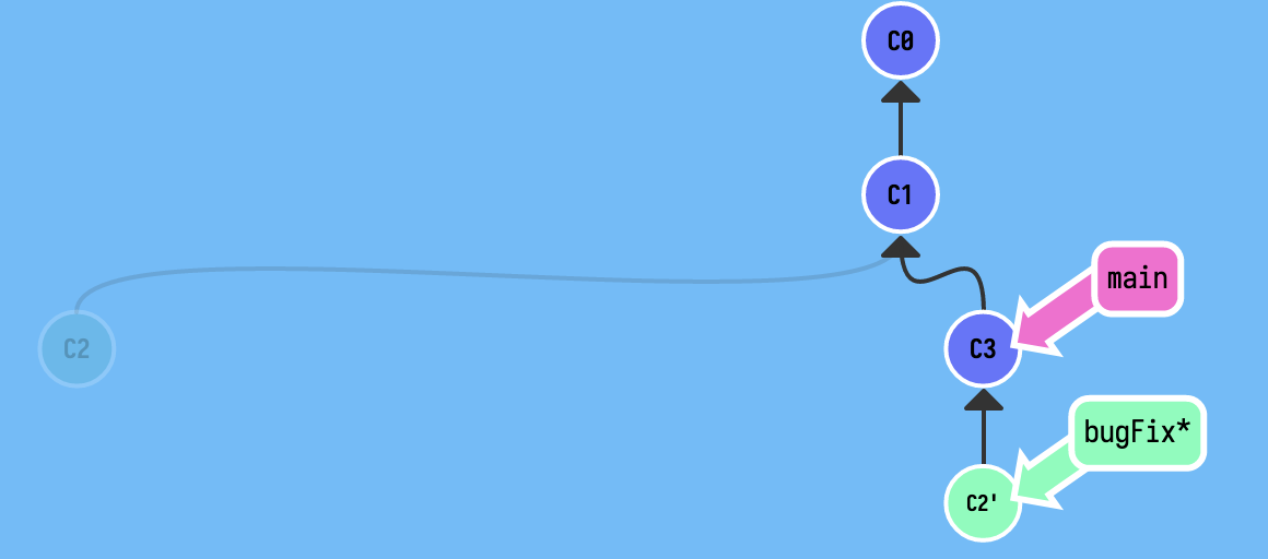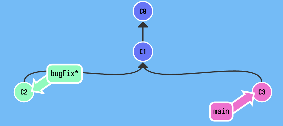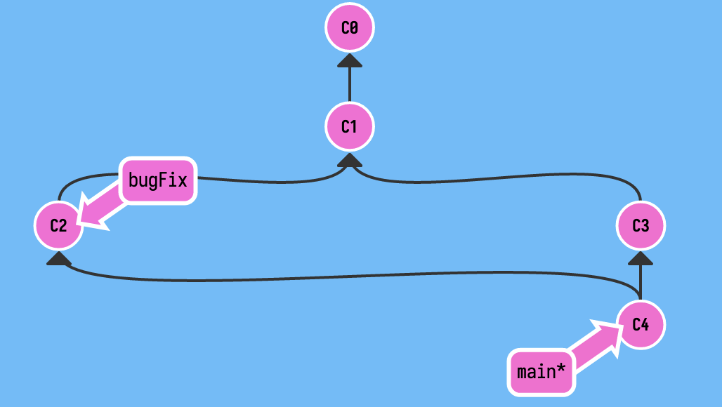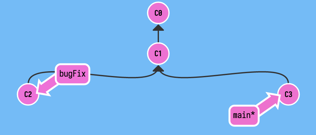 下面是一个示例,在 C1 时,项目进行了分支以进行 bug 的修复,现在修复完了,而 main 分支也进行了更新,现在如何将 bugFix 的改动合并到当前的 main 分支上呢?