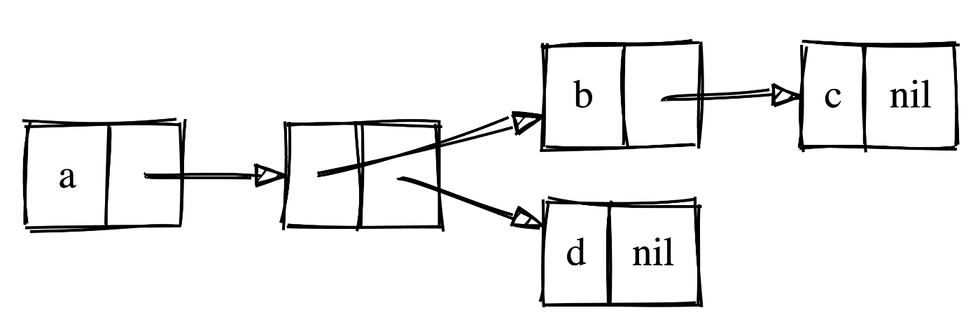 | digraph g { rankdir=LR; // 方向 node [shape = record]; // 默认所有 node 都是 record edge [tailclip=false]; // edge 不会被 clip——这是为了保证箭头从内部伸出 node0[label = "{a | <A>}"]; node1_0[label = "{<A>|<B>}"]; node1_1[label = "{b|<B>}"]; node2[label = "{c|nil}"]; node3[label = "{d|nil}"]; node0:A:c -> node1_0; // :c 是 node 默认提供的“锚点”,表示从中心开始 node1_0:A:c -> node1_1; node1_1:A:c -> node2; node1_0:B:c -> node3; // {rank=same;node1_0;node1_1;} 这玩意有 bug,对 record 会报错! }