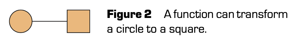 理解函数的一种方式是认为其将一种类型转换成另一种类型。让我们把两个类型可视化为两个形状,一个圆和一个正方形,就如图 1 所示。