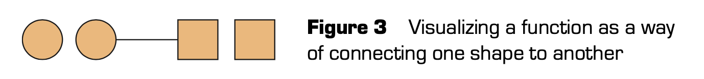 这些形状可以代表任意两个类型,比如Int和Double,String和Text,Name和FirstName以及其他。当你试图将一个圆转换成一个正方形的时候,你就在使用函数。你可以把函数可视化为两个形状间的一种连接(connector),如图 2 所示。
