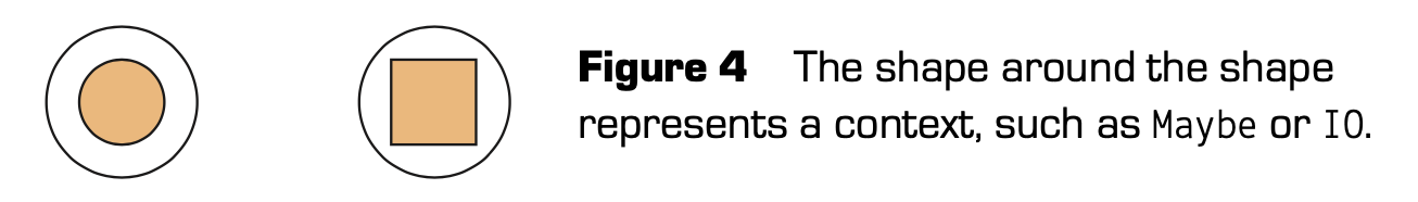 在这个单元,你将关注如何操作处于上下文(context)中的类型。你已经见过的两个关于上下文中的类型的最好的例子是Maybe类型和IO类型。Maybe类型代表这样一种上下文,即其中的值可能不存在;IO类型代表着这样一种上下文,即其中的值将同 I/O 交互(the value has interacted with I/O)。放到我们的可视化语言中,你可以想象上下文中的类型将像图 4 这样表述。