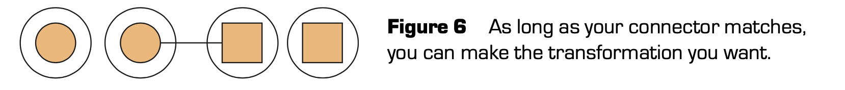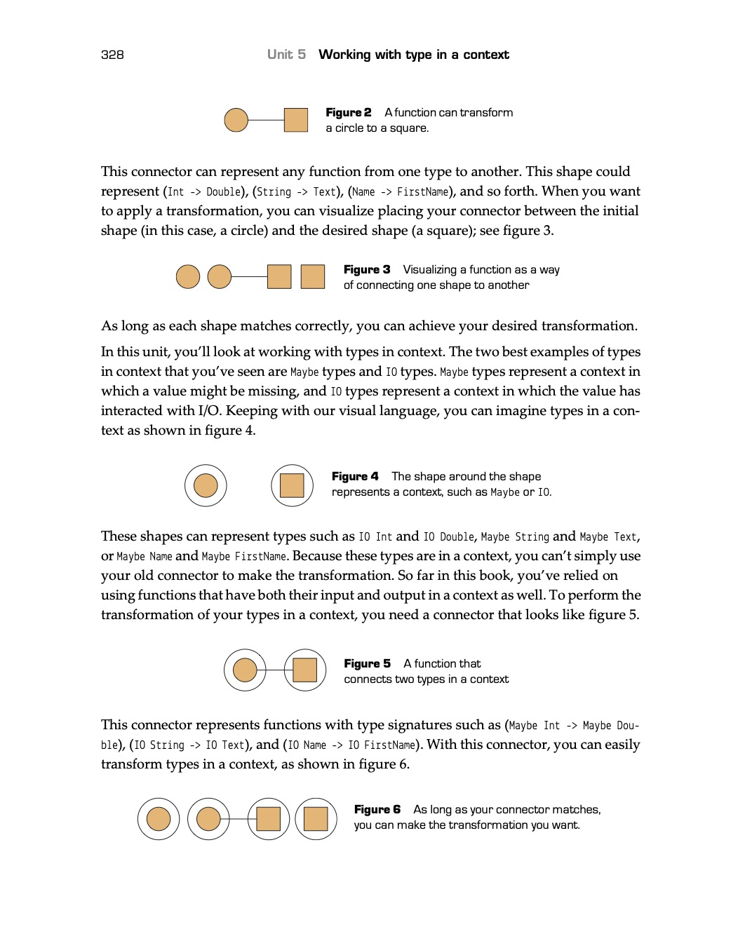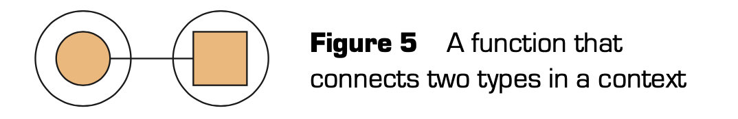 这些形状可以代表诸如IO Int,IO Double,Maybe String,Maybe Text,Maybe Name,Maybe FirstName等的类型。因为这些类型是处于一定的上下文中的,你不能用你的原有的连接去进行转换。当前,在本书中你曾依赖过那些输入和输出都处在同样的上下文中的函数。而为对上下文中的类型进行转换,你需要一个类似图 5 的连接。