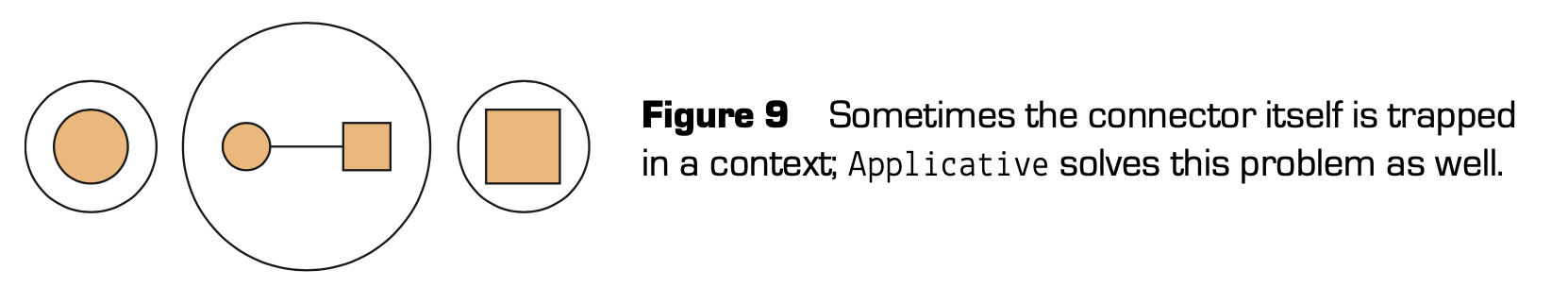 (Functor能解决一种类型不匹配问题),但仍有其它三种类型不匹配问题。Applicative能解决其中两种。其中第一种情况是连接的第一部分在上下文中,而结果不在,如图 8。