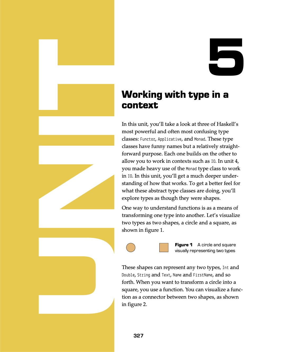 在这个单元里,你将关注 Haskell 的三个最具威力,但同时也最迷惑人的类型类:Functor,Applicative和Monad。这些类型类名字有趣,但其目的却相对的明确。它们中的每一个都建立在前一个之上,并提供你在诸如IO等上下文中进行操作的能力。在单元 4 里,你大量使用了Monad类型类以操作IO。在这个单元里,你将更深刻地理解其工作原理。为更好地感受这些抽象的类型类的行为,(在这里)你将把类型当作形状来看待。