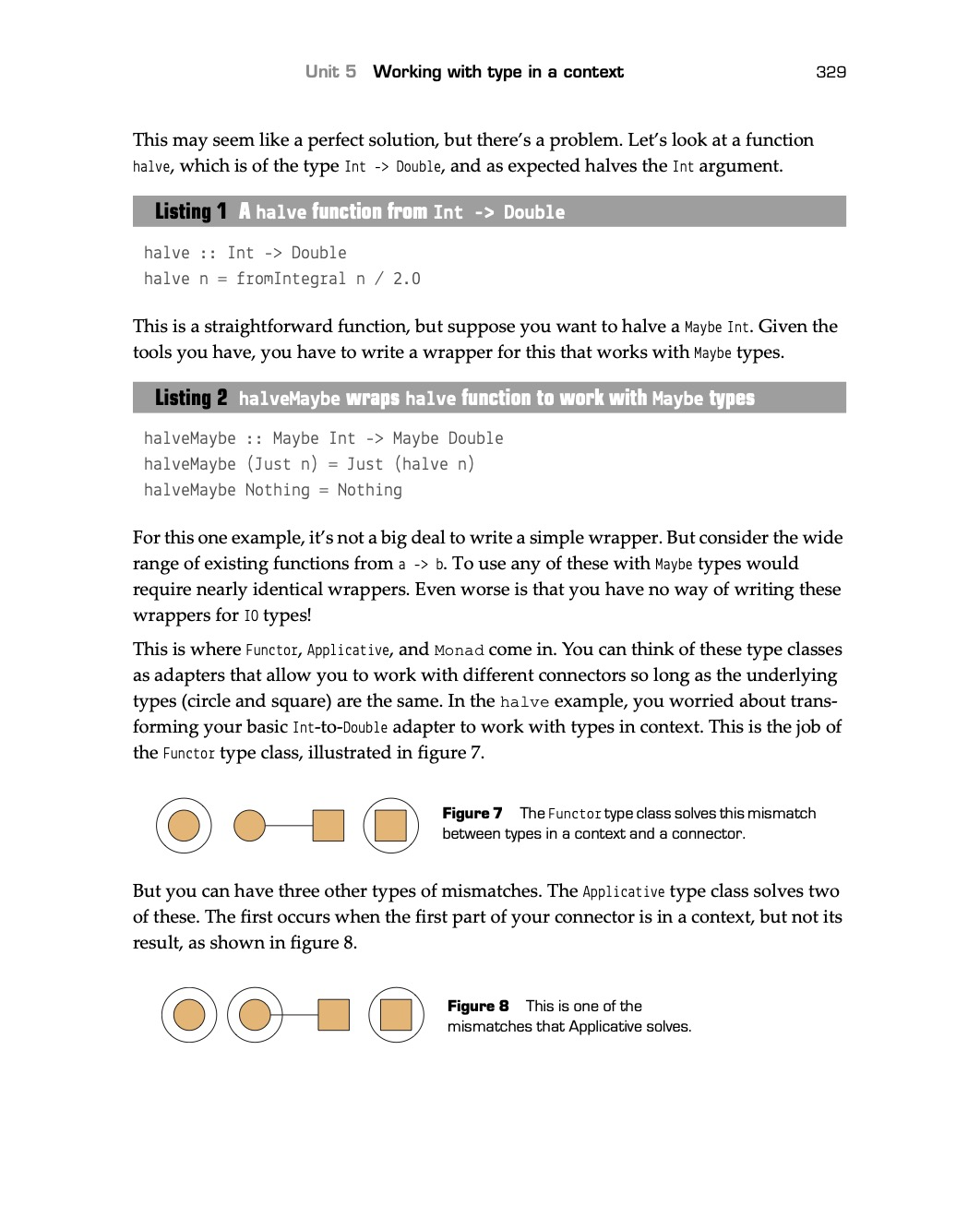 于是,我们的Functor,Applicative和Monad来到了!你可以认为这些类型类是适配器(adapter),它们允许你在底层(underlying)类型(圆和正方形)相同的情况下使用不同的连接(You can think of these type classes as adapters that allow you to work with different connectors so long as the underlying types (circle and square) are the same)。比如在halve中,你关心转换你的基本的Int到Double(的函数),使它能够适配以工作在上下文的类型中。这是Functor类型类的工作,如图 7。