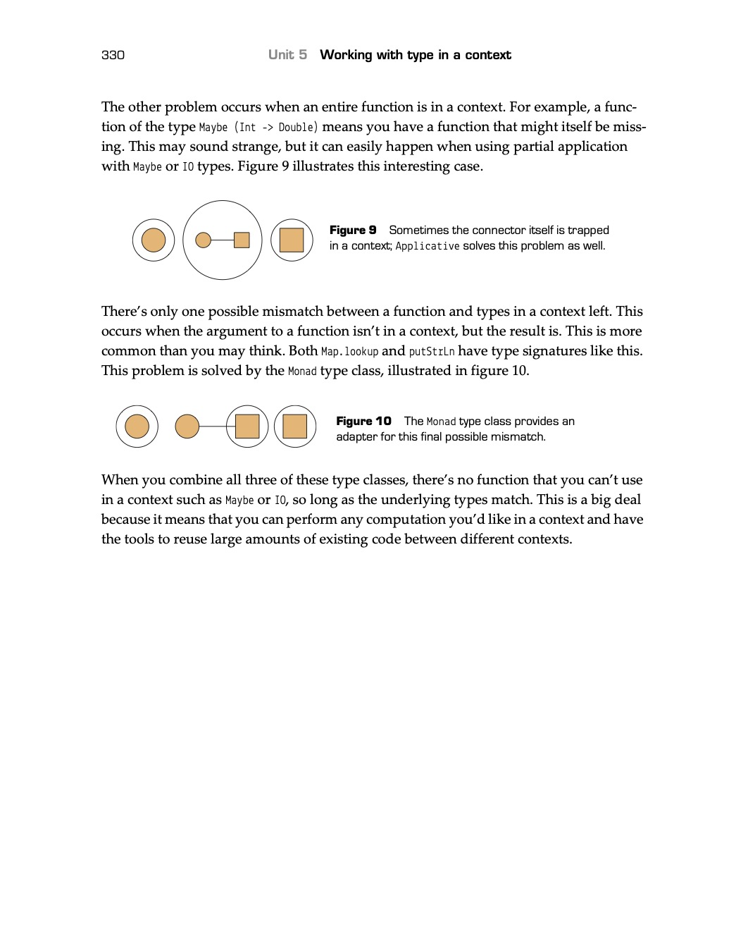 然后还有最后一种可能的函数和上下文中类型不匹配的情形。这种情况是参数不在上下文中,而结果在上下文中。这种情形比你想象中的更加普遍。如Map.lookup和putStrLn的类型签名都是这样。这个问题被Monad类型类解决,见图 10。