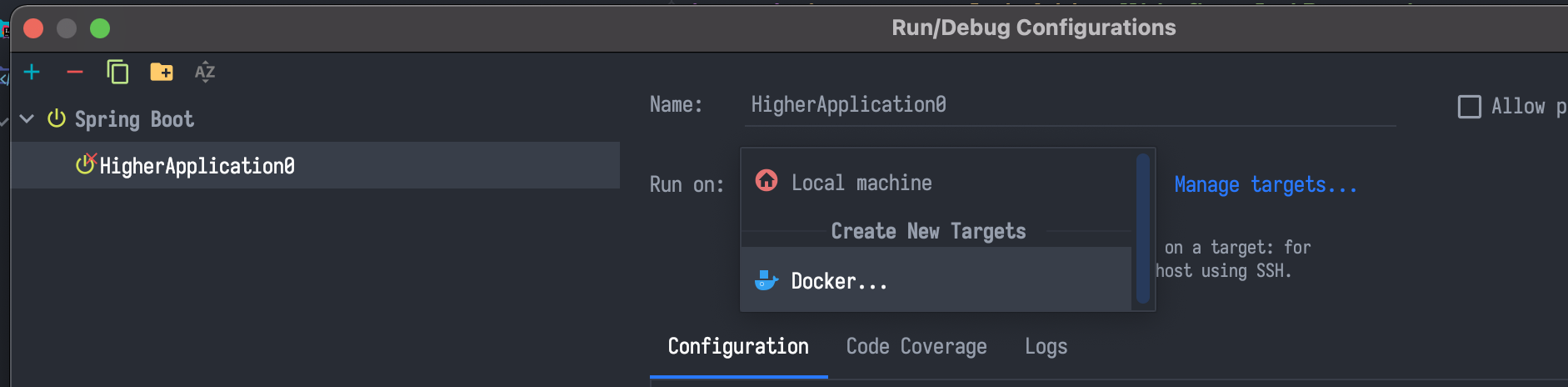 首先点击右上角的启动项菜单,选择Edit Configurations...,然后点击Run on菜单,选择Docker...。