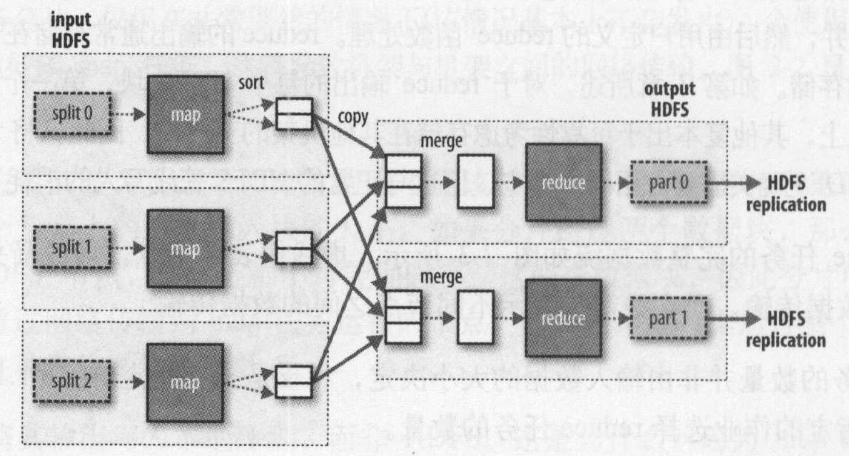 每个 ReduceTask 都包含所有 MapTask 的结果的一部分,比如说,假设它的 partitioner 是按字符串的“基数”进行分区,则 MapTask1,2,3 的结果中可能所有 A、B、C 开头的所有单词会传递给 ReduceTask1,D、E、F 开头的所有单词会传递给 ReduceTask2……但实际的 partitioner 一般使用哈希算法,以保证分区尽量均匀;而用户则需要保证每个 MapTask 的输出值尽量均匀,即每个 K 对应的 V 的数量尽量相同,从而保证每个 ReduceTask 的工作量基本相同。