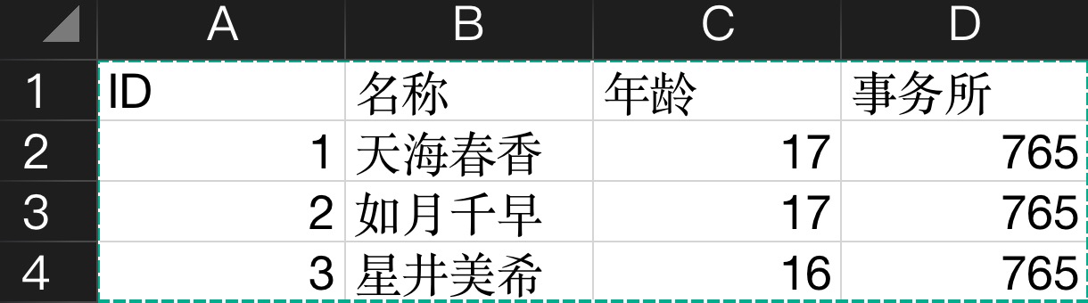 1 2 3 4 5 6 7 8 9 10 11 12 13 14 15 16 17 18 19 20 [ { "名称" : "天海春香" , "ID" : 1.0 , "事务所" : 765.0 , "年龄" : 17.0 } , { "名称" : "如月千早" , "ID" : 2.0 , "事务所" : 765.0 , "年龄" : 17.0 } , { "名称" : "星井美希" , "ID" : 3.0 , "事务所" : 765.0 , "年龄" : 16.0 } ]