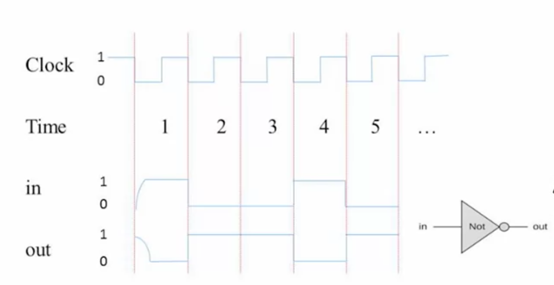 在模拟时,周期要分为两个部分——tick 和 tock,tick 是存储器根据输入更改当前存储的值的时刻(此时处在周期的一个中间状态,似乎是上升沿),tock 是存储器修改输出值的时刻;tick 是当前周期的一个中间状态,tock 是下一个周期的开始。更多细节将来在其他课程再学。