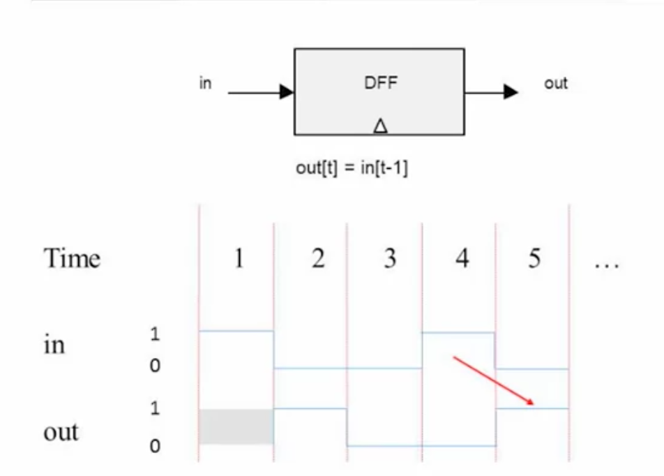 时序逻辑使能够引入状态,让输出能够被当前状态(或者说上一次的输入)来决定。时序逻辑会引入时钟,最基础的能够保持状态的芯片叫做 DFF,Data flip-flop,它的行为是每个时刻输出上一个时刻的输入,out(t) = in(t - 1),这里的 t 指第 t 个时钟周期。