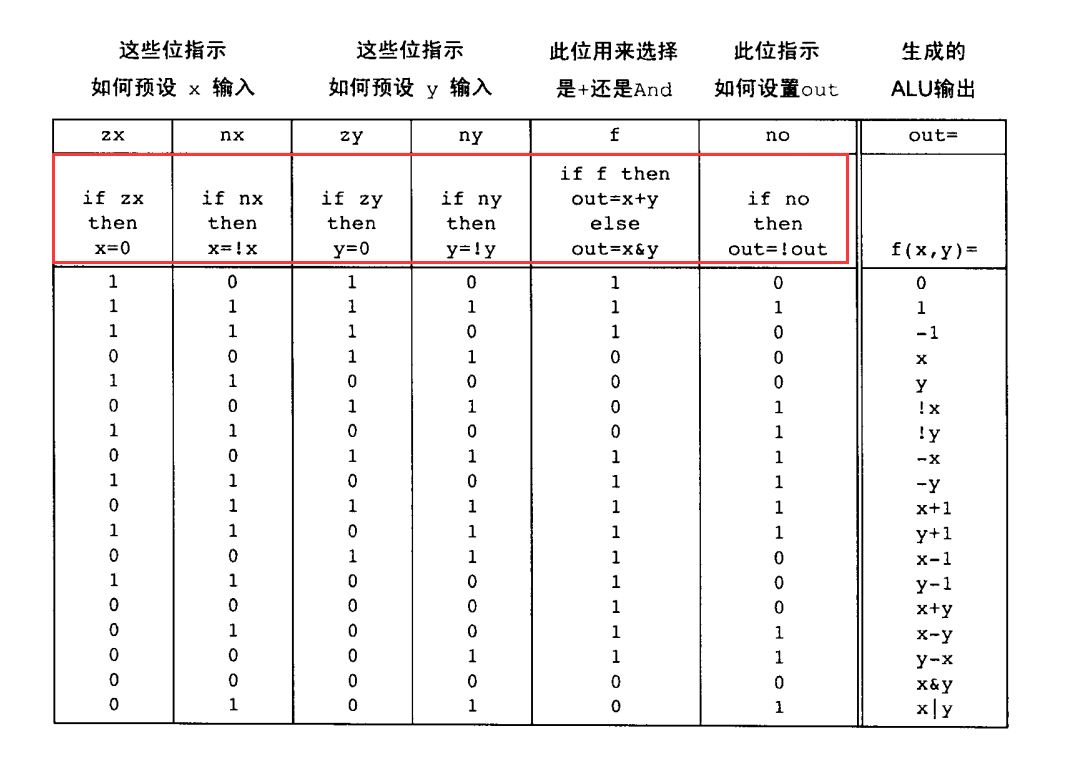 关于这里的 f,它是数个 bit 的标识位,从外界看来,特定 bit 的组合会标识要使用何种计算功能,在实现上,这些每个 bit 都是在通过对 x,y,x 和 y 要进行的运算,out 进行一系列的修改来最终实现特定的效果(即用户看到的功能),比如这里要实现的 ALU 有六个标识位,每个标识位代表对 x,y 先执行特定操作,使用何种运算,以及对 out 做何种操作。