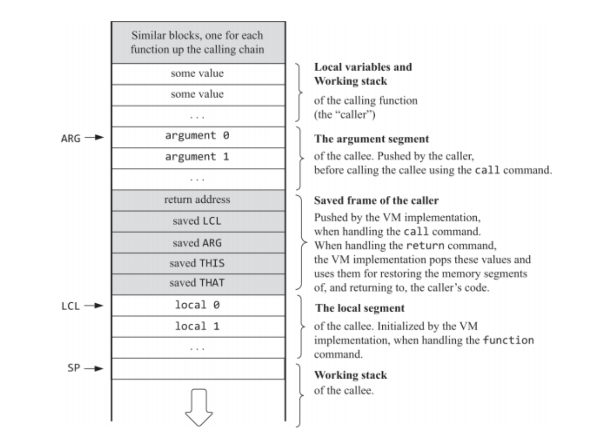 这一堆玩意怎么做到?考虑到函数调用是可以任意嵌套的,这里需要一个类似链表的结构去记录当前函数的调用者使后续能够返回,这实际上就是函数调用栈。对每次函数调用,都需要创建一个栈帧去保存它的相关信息,比如 local,argument,this,that 段地址,当前栈。