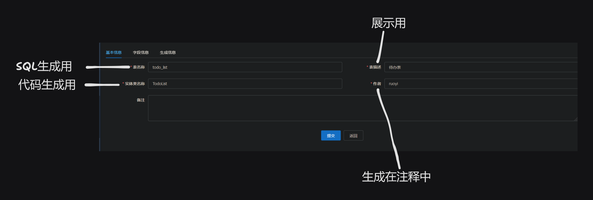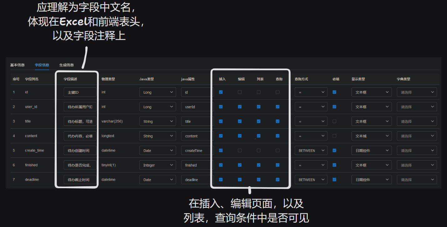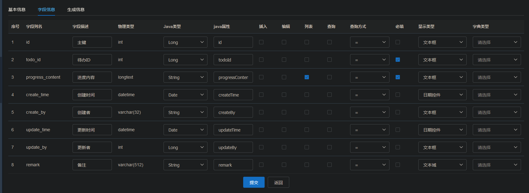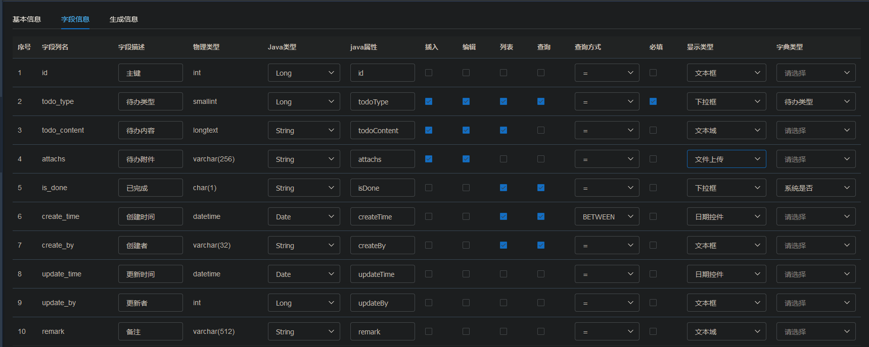字段信息中,编辑这一列似乎没有任何影响。此外对于主键以及 createTime,createBy,updateTime,updateBy 四个字段,添加和编辑这两列是否选中都不会让它被显示出来。