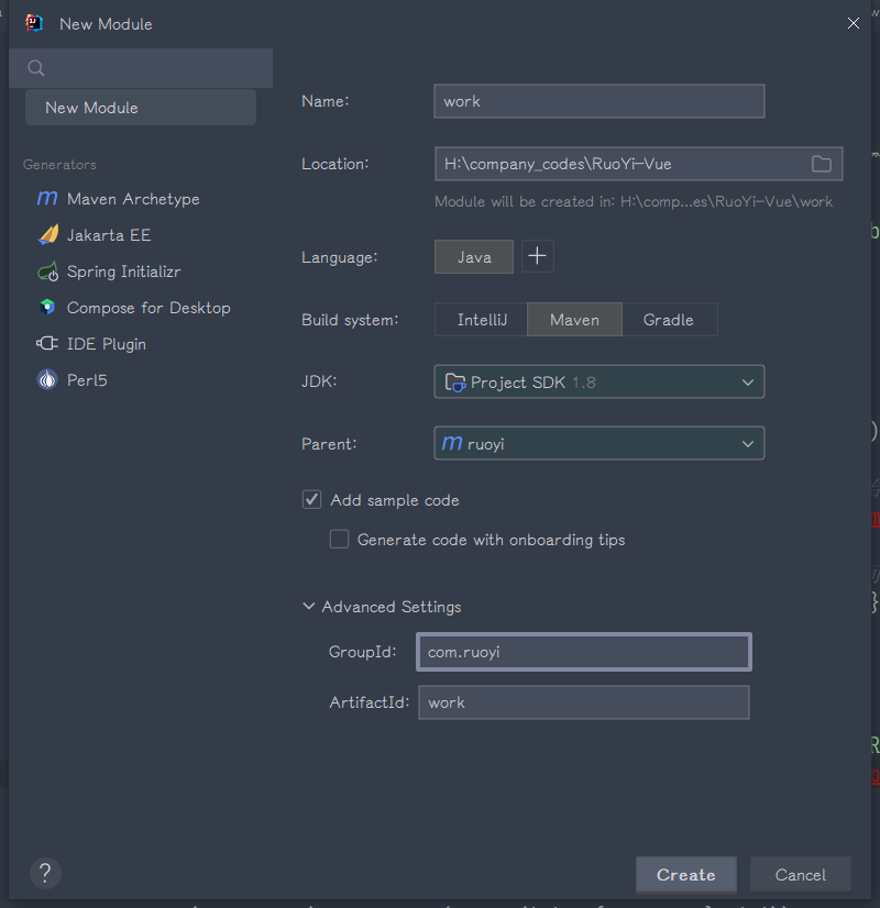 ruoyi-admin同级,指定父项目为ruoyi,groupId为com.ruoyi,artifactId为work