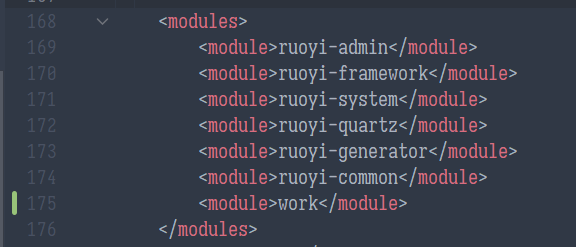 此时ruoyi/pom.xml中的 modules 部分应当也引用 work: