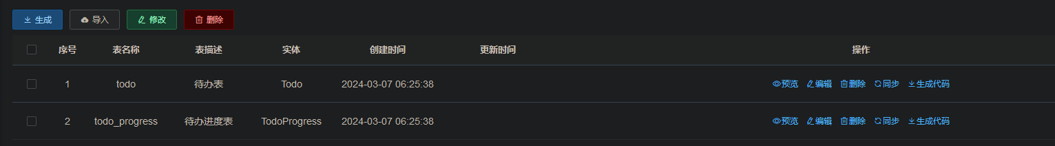进入系统工具-代码生成,点击导入,导入两表: