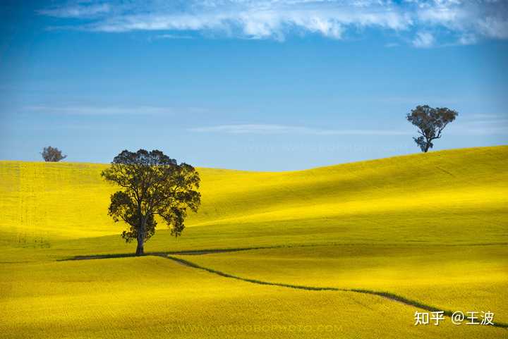 下面这张照片中的油菜花还有树都是重复元素,近处和远处的油菜花相差很小,而画面左右的两棵树,应该相距比较远,但是大小差别不大,由此可以推断是长焦拍摄,而且是比较长的长焦。