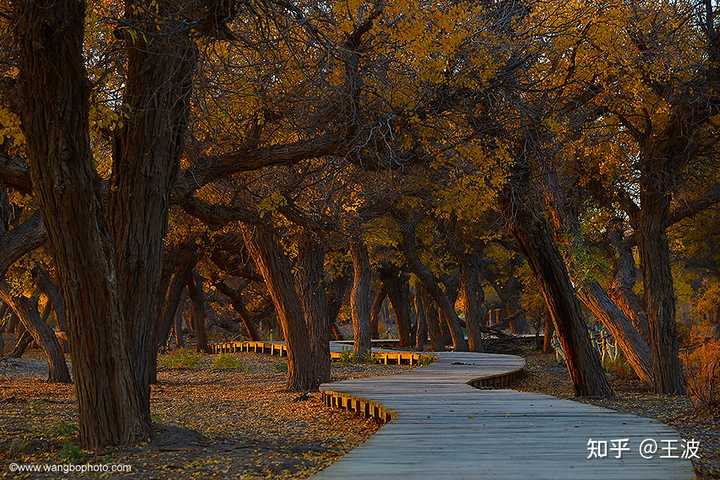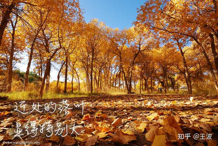 下面这张额济纳旗拍摄的胡杨林,满地的落叶,但是近处的落叶显得特别大,特别夸张,所以这是用超广角拍摄的。(其实是因为我们离开很近的关系)