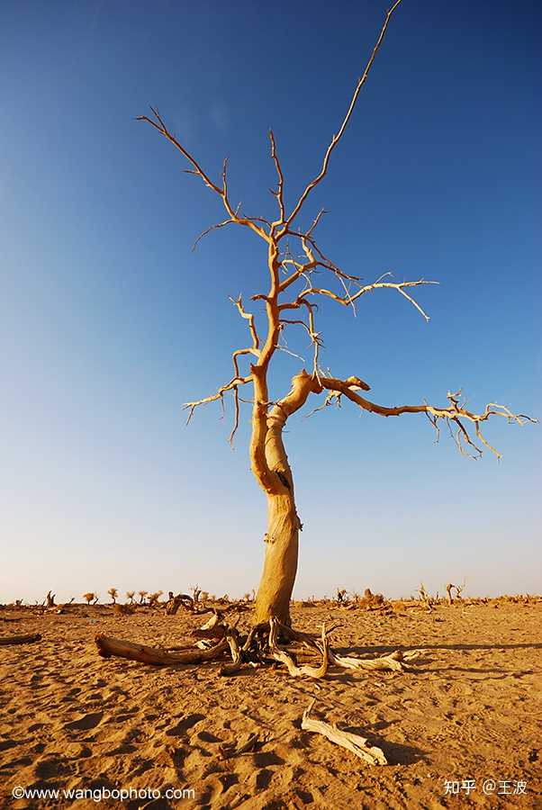 下图拍的是死胡杨,这个地方并非只有一棵树,如果我们细心观察,我们会发现远处的地面,有很小的胡杨树干,这就是附近的胡杨树,只是在超广角镜头的作用下,前景被极度夸大,后景被极度缩小,所以形成了这样的效果,远远超出人眼的透视感受,我们可以推测这张照片是使用超广角拍摄。