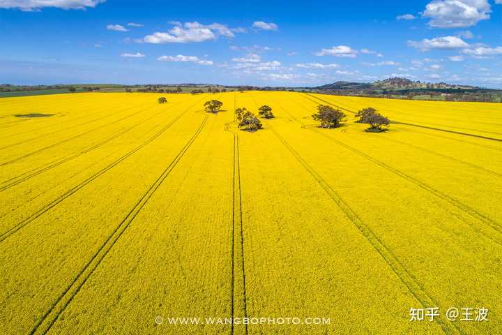 下面这张油菜花,地面的线条汇聚成远方的一点,聚拢效果明显,但是根据常识判断,这应该是收割的车压出的线,应该是平行的,所以这样的聚拢效果,是因为广角镜头没有垂直地面拍摄,而是斜角度俯瞰造成的,所以这张镜头应该是用广角拍摄的。