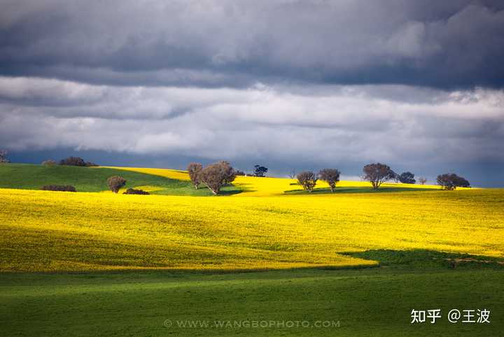 下面这张图中的油菜花和树都是重复元素。从地势的起伏可以看出画面包含的前后距离其实很远,但是前面绿色的作物和黄色的油菜花大小看不出区别,画面里的树也显得大小都差不多,由此可以猜测是用非常长的长焦拍摄的。