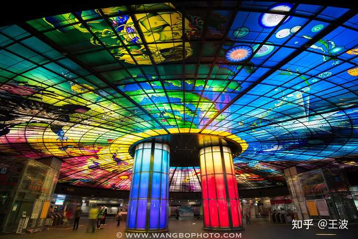 下面这张拍摄的高雄的美丽岛火车站,从照片可以看到中间的立柱,是下宽上窄,延伸出去以后会汇聚一点,而根据常识我们可知,这两根立柱应该是垂直地面平行的,所以这应该是广角镜头有仰角拍摄的。
