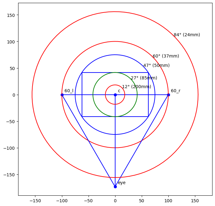 下面使用 matplotlib 绘制各典型焦距的 FOV 圆,这个可以在脑子里留下一个印象,因为它的比例是绝对的。