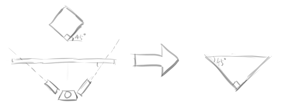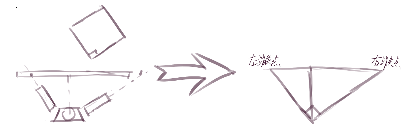 这里最下方绘制一个眼睛,它是怎么来的?回忆是如何得到 90 度视圈的——沿 Z 轴旋转 45 度一个立方体,然后找它的两个消失点。这时候,想象直面画布,左手指向左消失点(因此左手和左侧面的顶线,底线是平行的),右手指向右消失点,然后在中间放置画布;绘制这时候的俯视图: