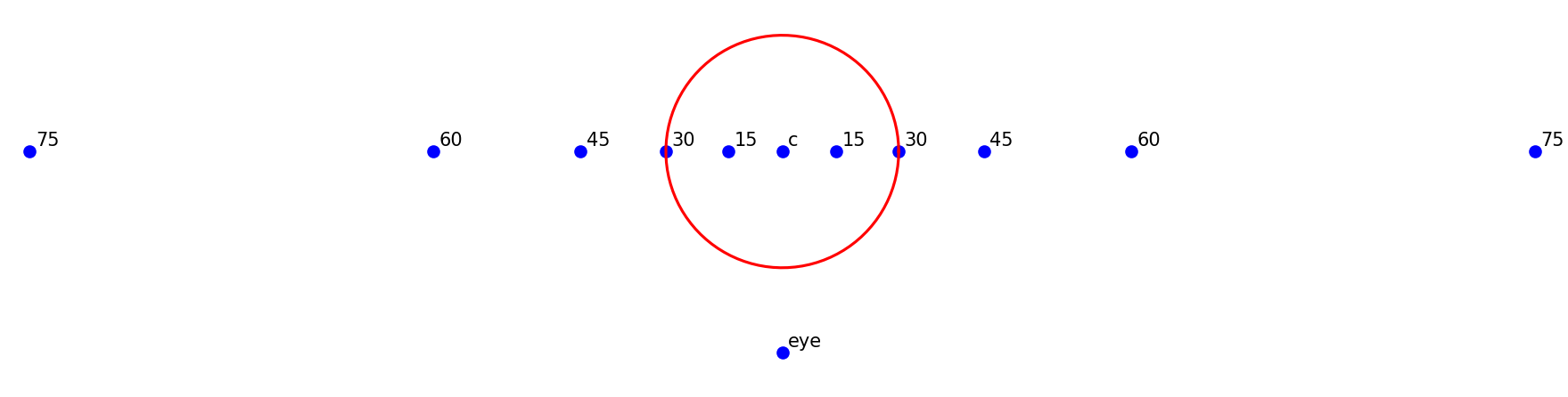 - 90 度视圈左右的点称为距点,下方的点称为目点;心点和距点的距离(实际上是心点到目点的距离)称为视距。注意目点相对于 60 度 FOV 的距离——目点到心点的距离是 60 度视圈半径的 $\sqrt {3}$ 倍,约等于 1.7 倍,但实际操作的时候使用 2 倍也没问题(这时候实际上对应的是 53 度视圈)