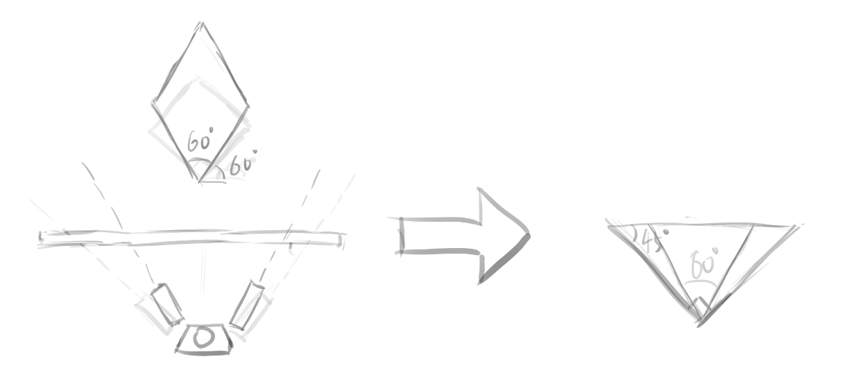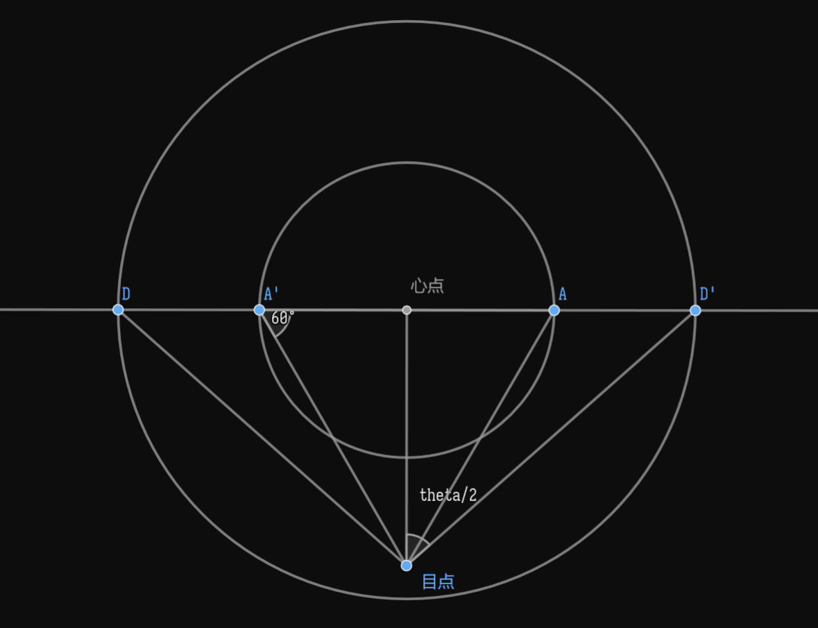 下图中,较小的圆是 60 度视圈,较大的圆是要得到的视圈,theta(即 $\theta$)是视圈的 FOV,注意到,设 60 度视圈的半径为 $d$,则心点-目点长度为 $\sqrt{3} d$,设所求 FOV 视圈的半径 x,则有: