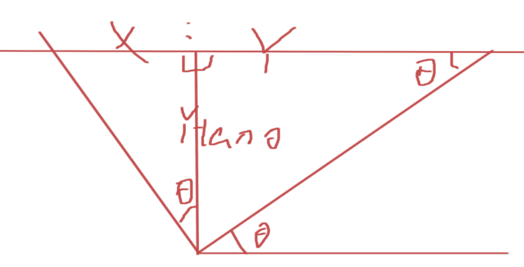 在研究 FOV 和消失点的关系时,研究发现,90 度的水平 FOV 时,沿 Z 轴旋转 45 度的立方体的消失点正好在画布边缘,进一步研究得到一个公式:假设水平 FOV 为 $\theta$ ,计算能够发现,对于一个 Z 轴旋转 45 度的立方体,有