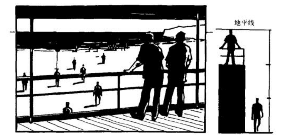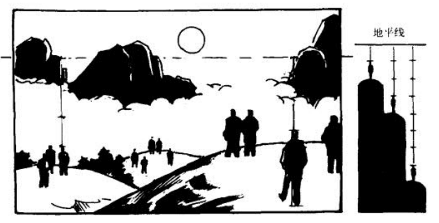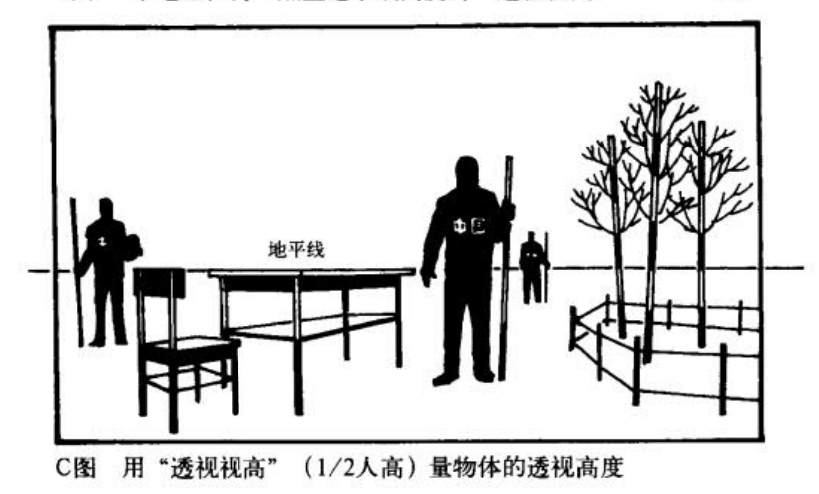 容易发现,视高法利用上了镜头的高度(地平线),不用画缩尺就能画出不同远近的人。视高法就是利用视高的透视高度就地量得物体的透视高度。