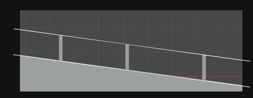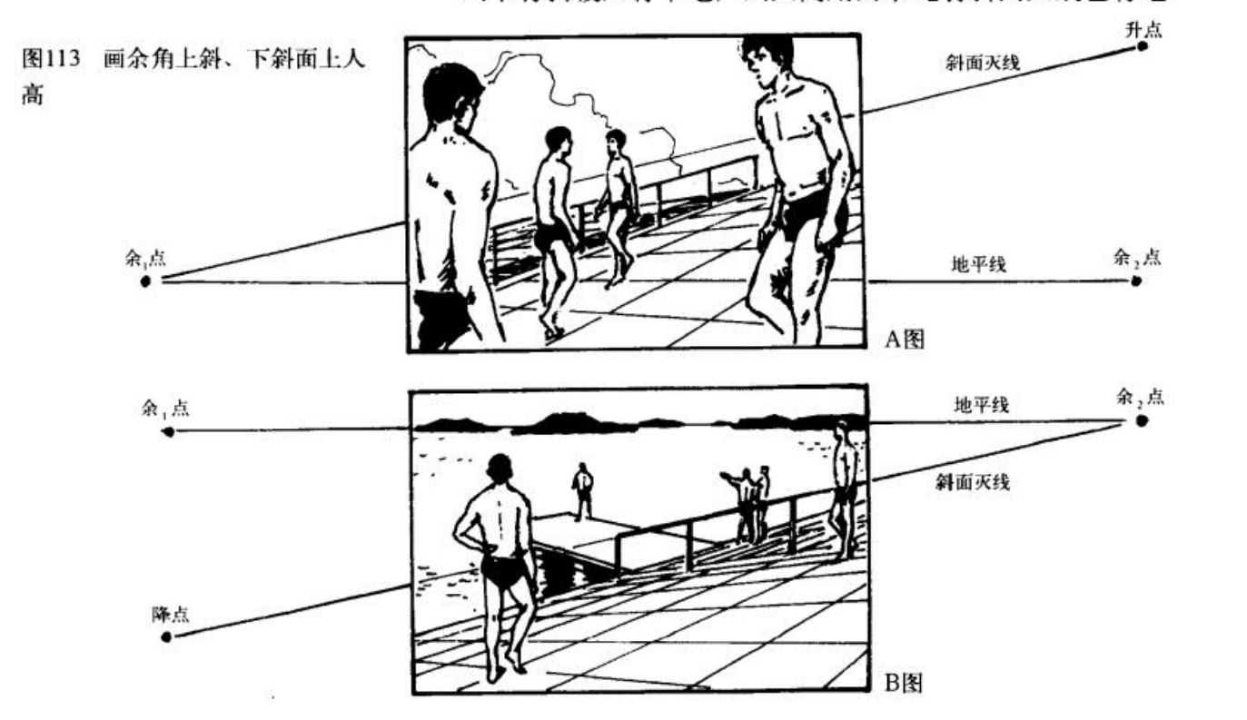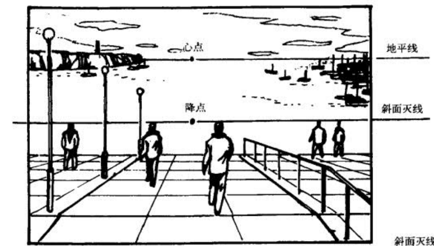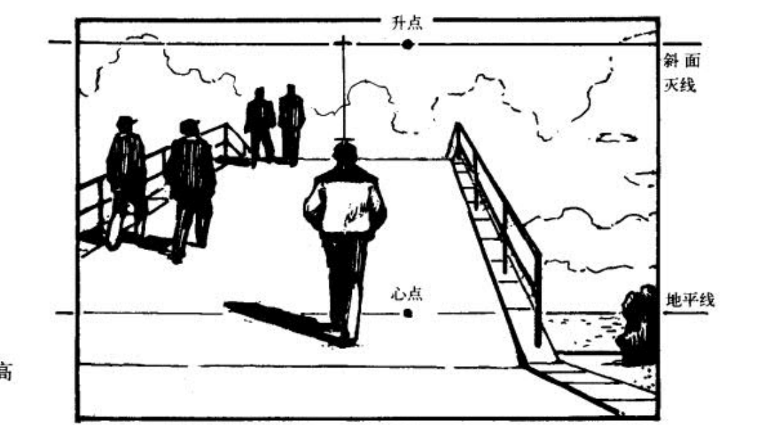 我们说,镜头在人的头顶平面上时,视高为 1 人高,镜头在斜面上时,视高为 0。倘若规定镜头的方位,只控制镜头的高低来控制视高,这时候是怎么操作呢?我们发现,镜头垂直移动时,距离上斜、下斜平面在铅垂方向上的距离就是视高,此时斜面灭线替代了地平线,这是说,斜面上任何一点到灭线的铅垂高度就是视高。