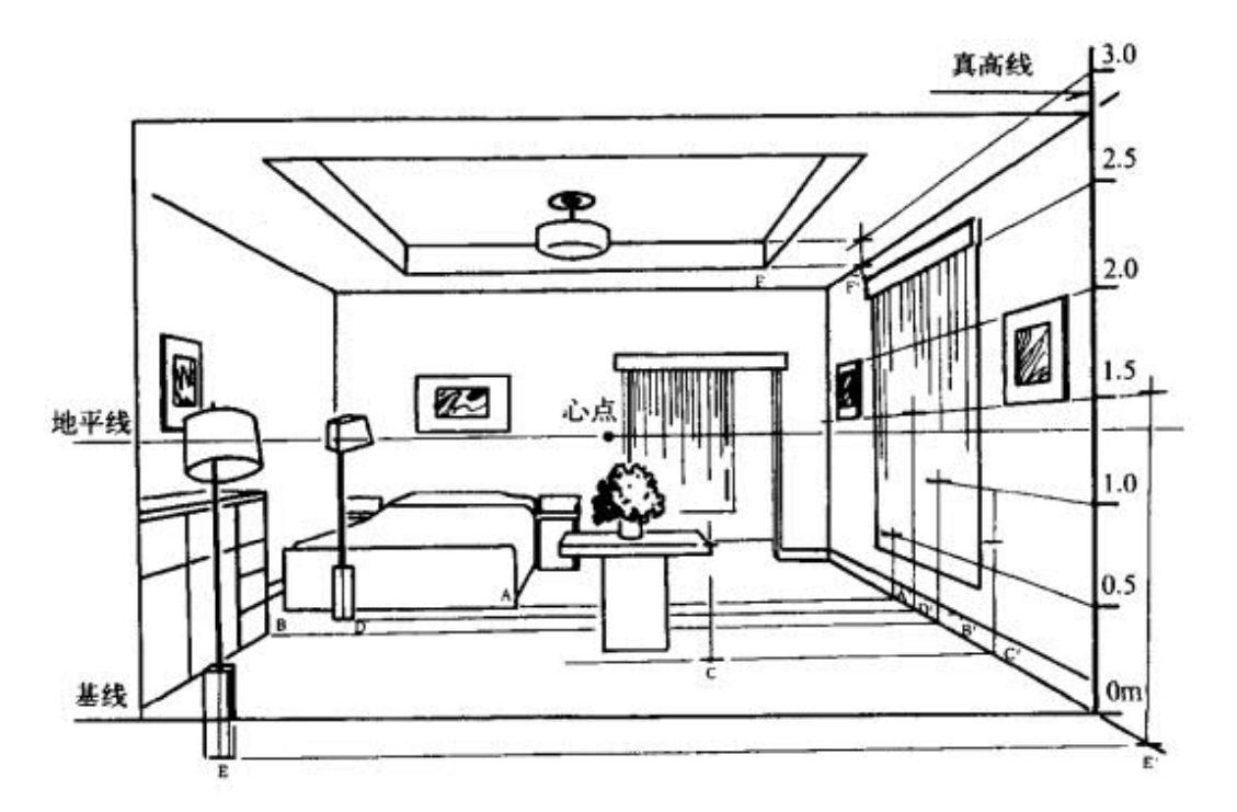 缩尺法利用画面上已有的垂直原线,作图得到新的和它在三维空间商等长的垂直原线: