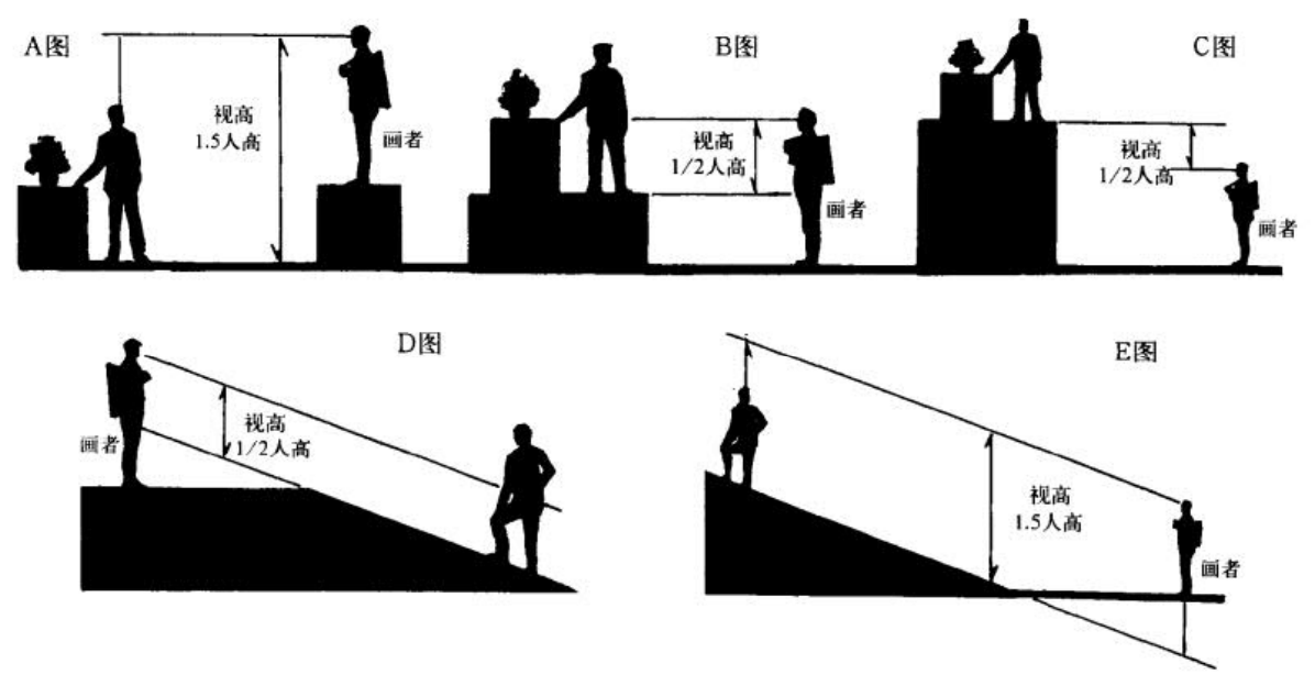 通过这几种斜面,就能够写出更广泛的视高的定义:视高是眼睛位置和被画物体所在平面的铅垂方向的距离,视高是随物体所在平面改变的,换一个平面,就要换一个视高算法。