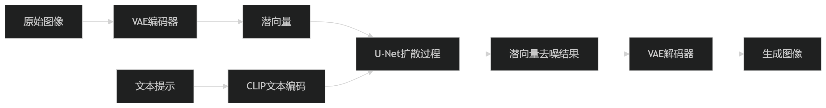 进行图像到潜在表示的转换工作的是 VAE(Variational Autoencoder,变分自编码器),它也是基于深度学习的,但这里不研究它,这里只需要明确,VAE 和文本描述是无关的,VAE 只关心图像本身。图像到潜空间(潜在表示)的步骤称为编码 Encode,从潜在表示到图像的步骤称为解码 Decode,这些步骤中文本不会参与。