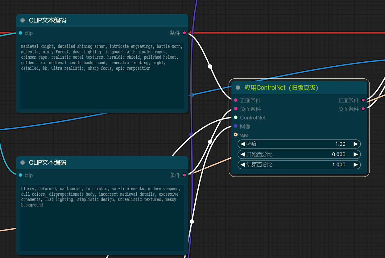 一个有趣的事是,在 ComfyUI 中,ControlNet 接受的是 CONDITIONING 类型(如 CLIP 文本编码,或者其他 ControlNet 的输出),输出的也是 CONDITIONING 类型;要应用上 ControlNet,只需将 ControlNet 节点置于 CLIP 文本编码器和 K 采样器之间: