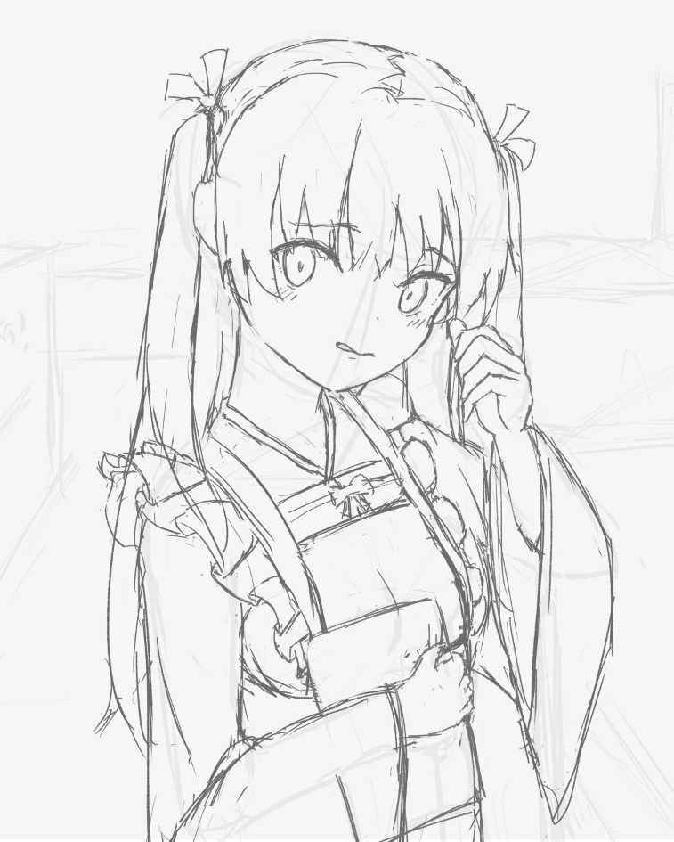 然后是透视草图,这幅图的第一主角是惠惠,惠惠的头正好是场景消失点附近的位置,场景的线条应该能够引导视线。话说回来,我先画出来再说这个啊!