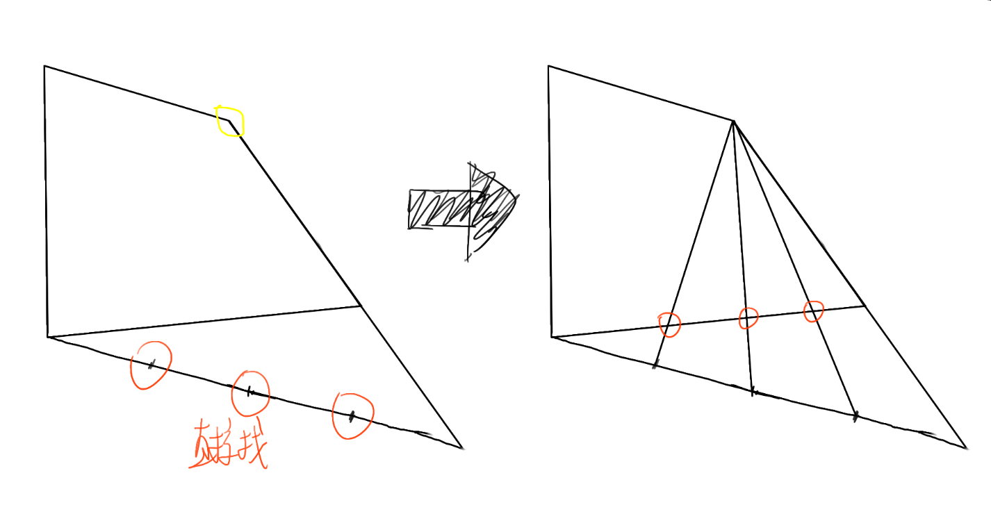 以水平边方向为例(即上下的边),以底边为例,从底边的更近(即更远离消失点)的点出发,做顶边的画面上的平行线(注意,这里是画面上的平行线,而非空间上的,看上去差不多平行就行了):